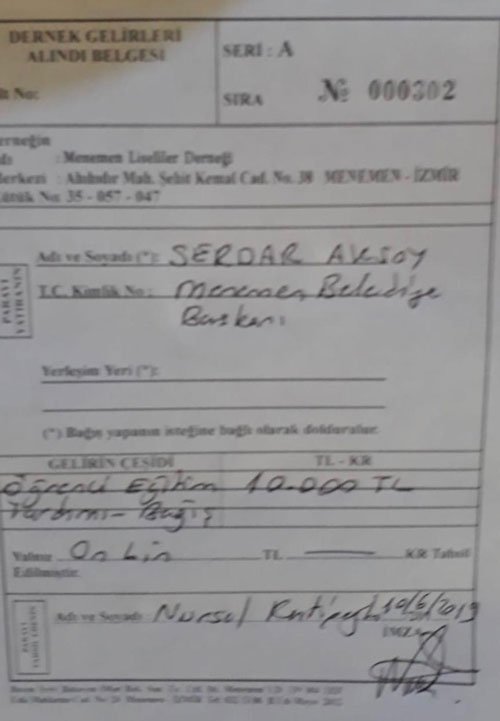 Menemen Liseliler Derneği'ne, kendinizi müdür olarak atayıp, her ay aldığınız 10 bin TL’yi bağışladığınıza dair dernek makbuzları: